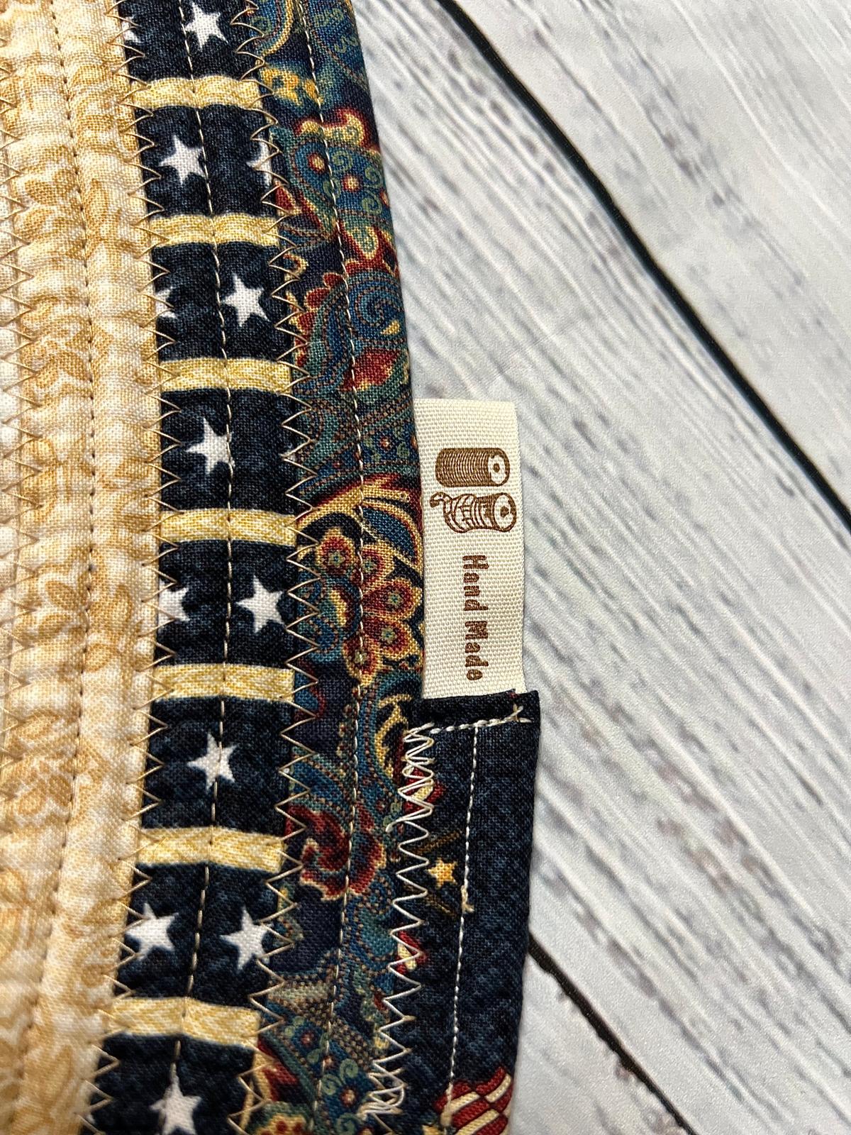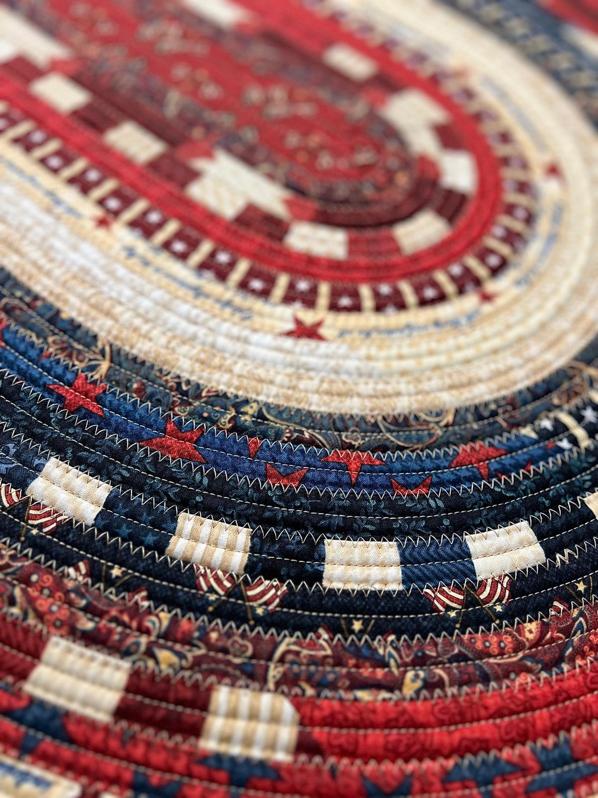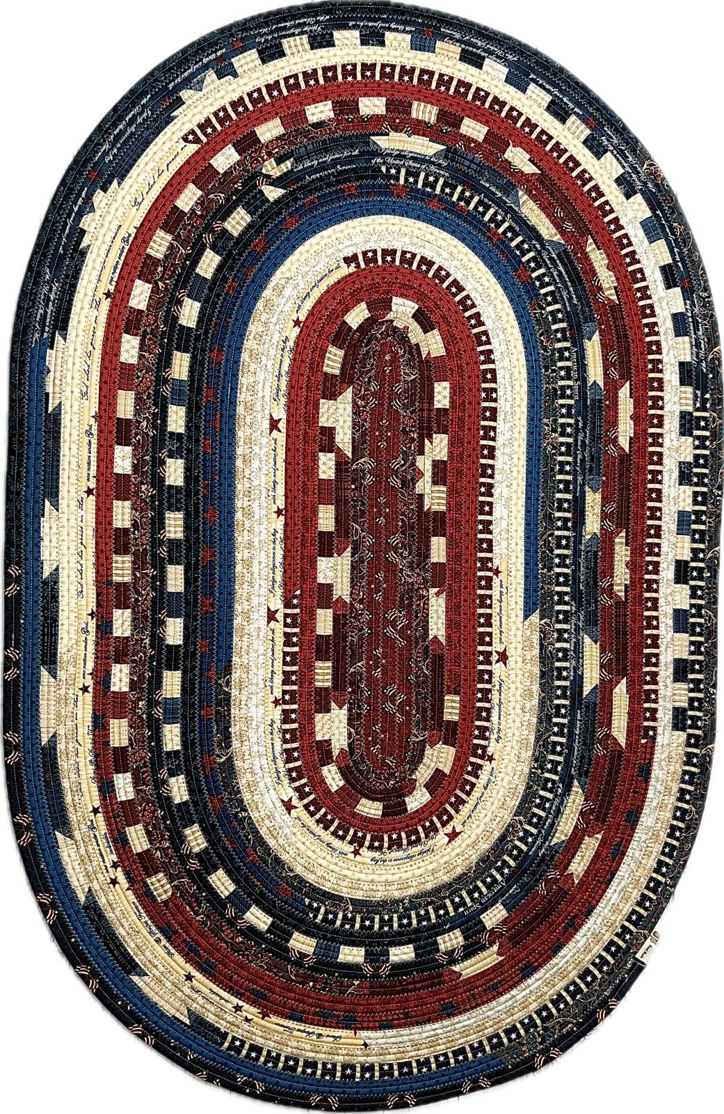 This unique jelly roll rug is made with multi-colored cotton fabric and cotton blend batting. Fabric designed by Cheryl Haynes for Benartex. Size Approximately 29"X42"