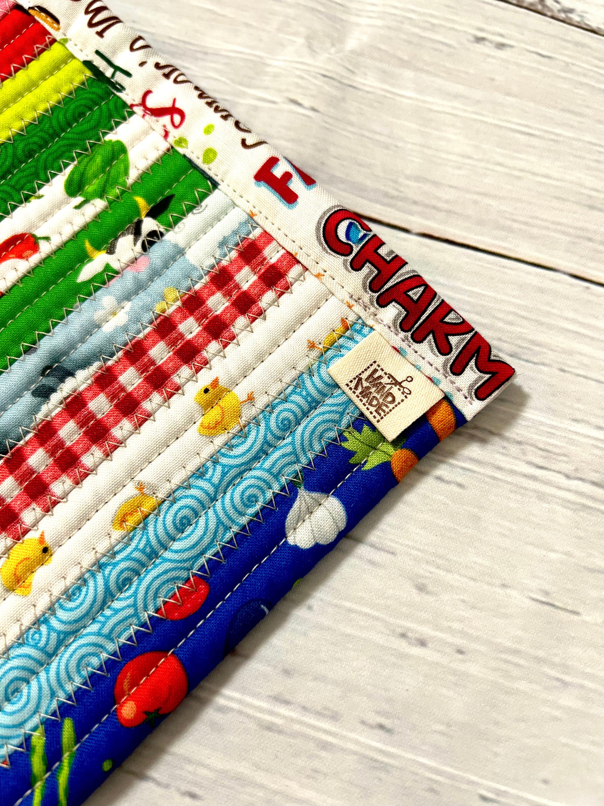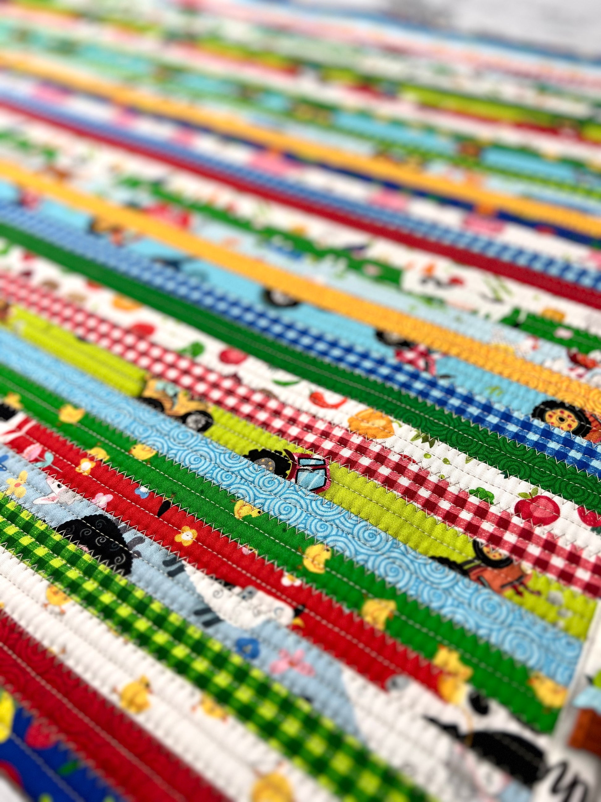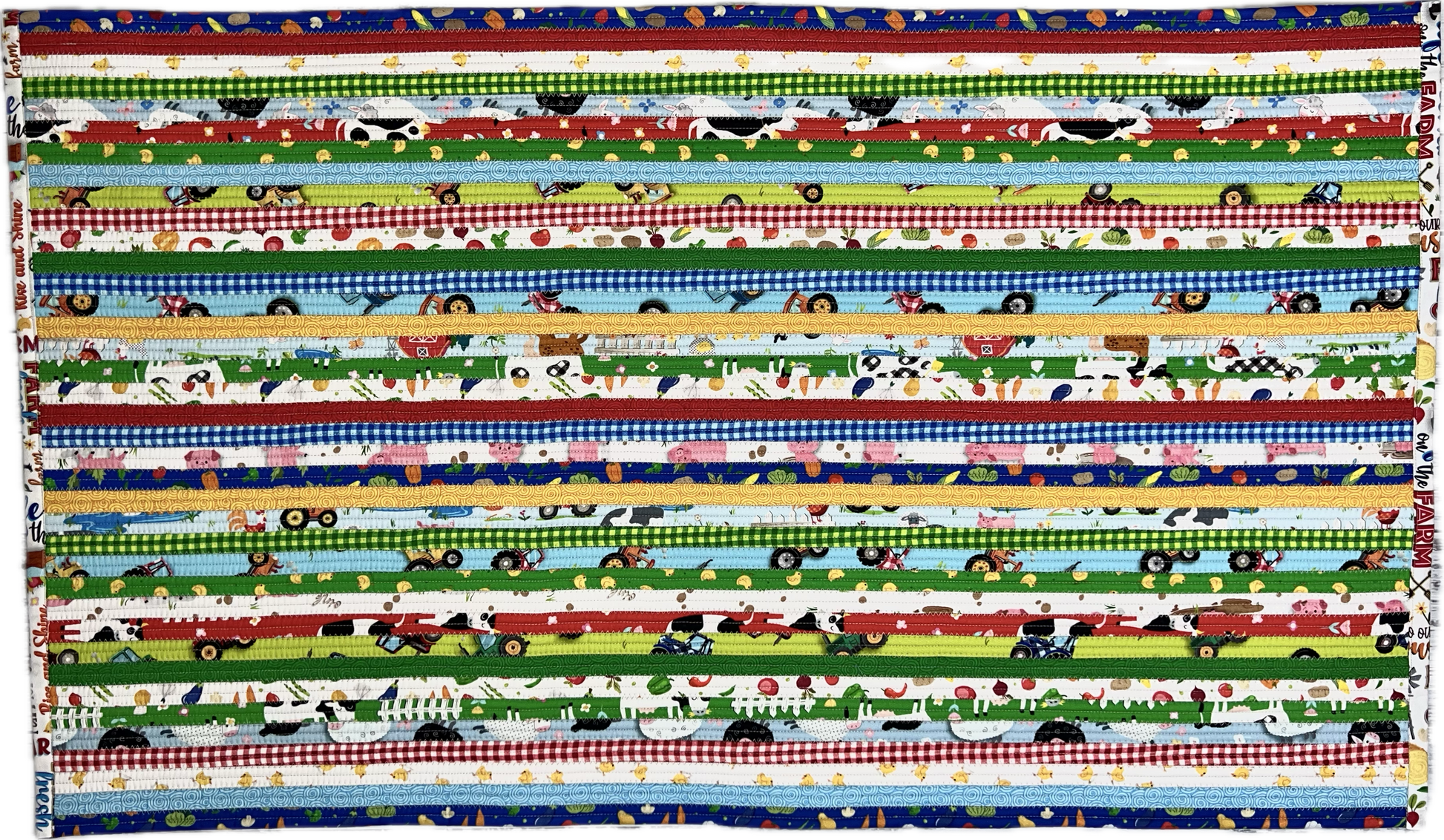 This unique jelly roll rug is made with multi-colored cotton fabric and cotton blend batting. Fabric designed for Benartex Kanvas. Size Approximately 24"X40"