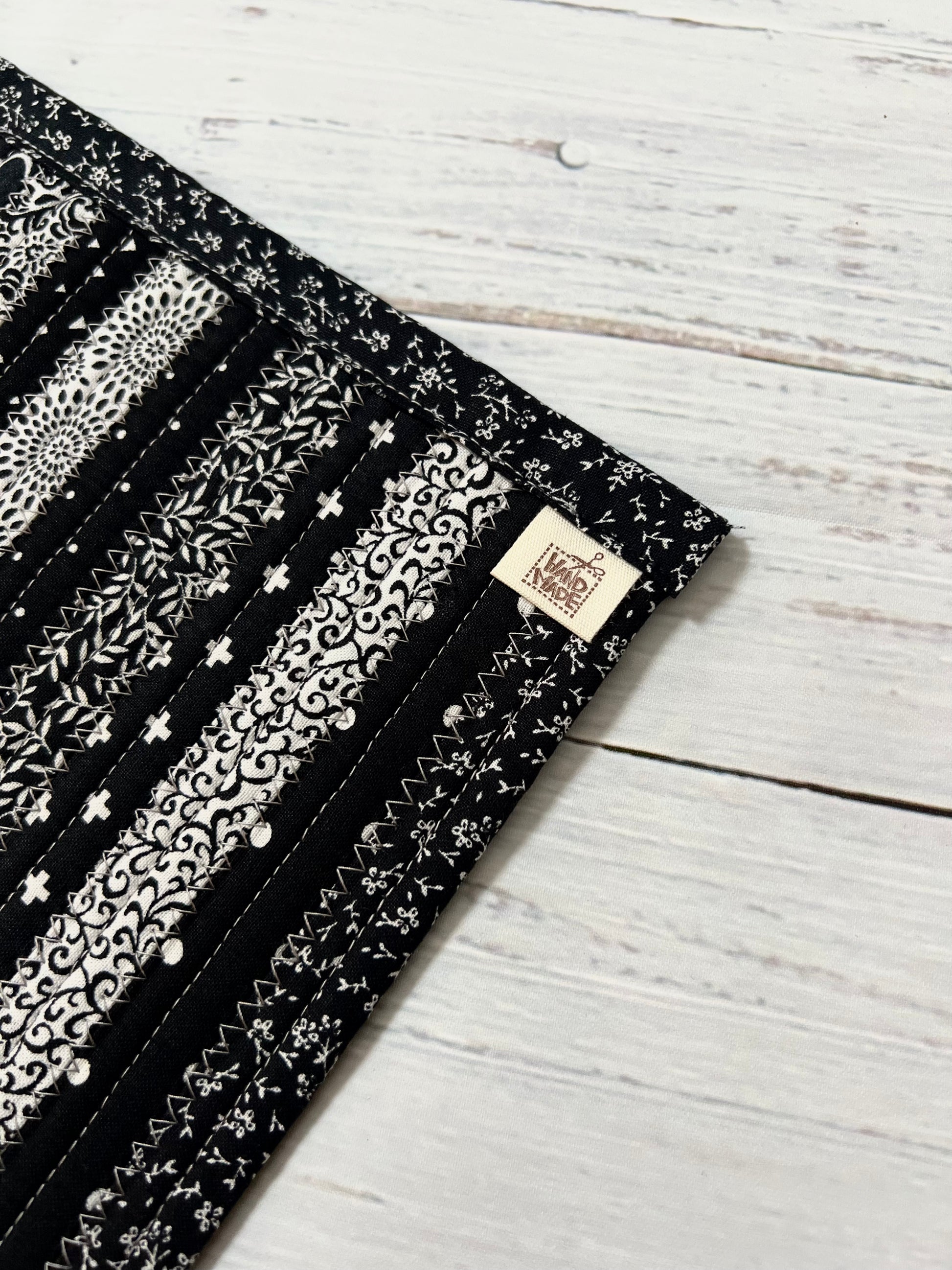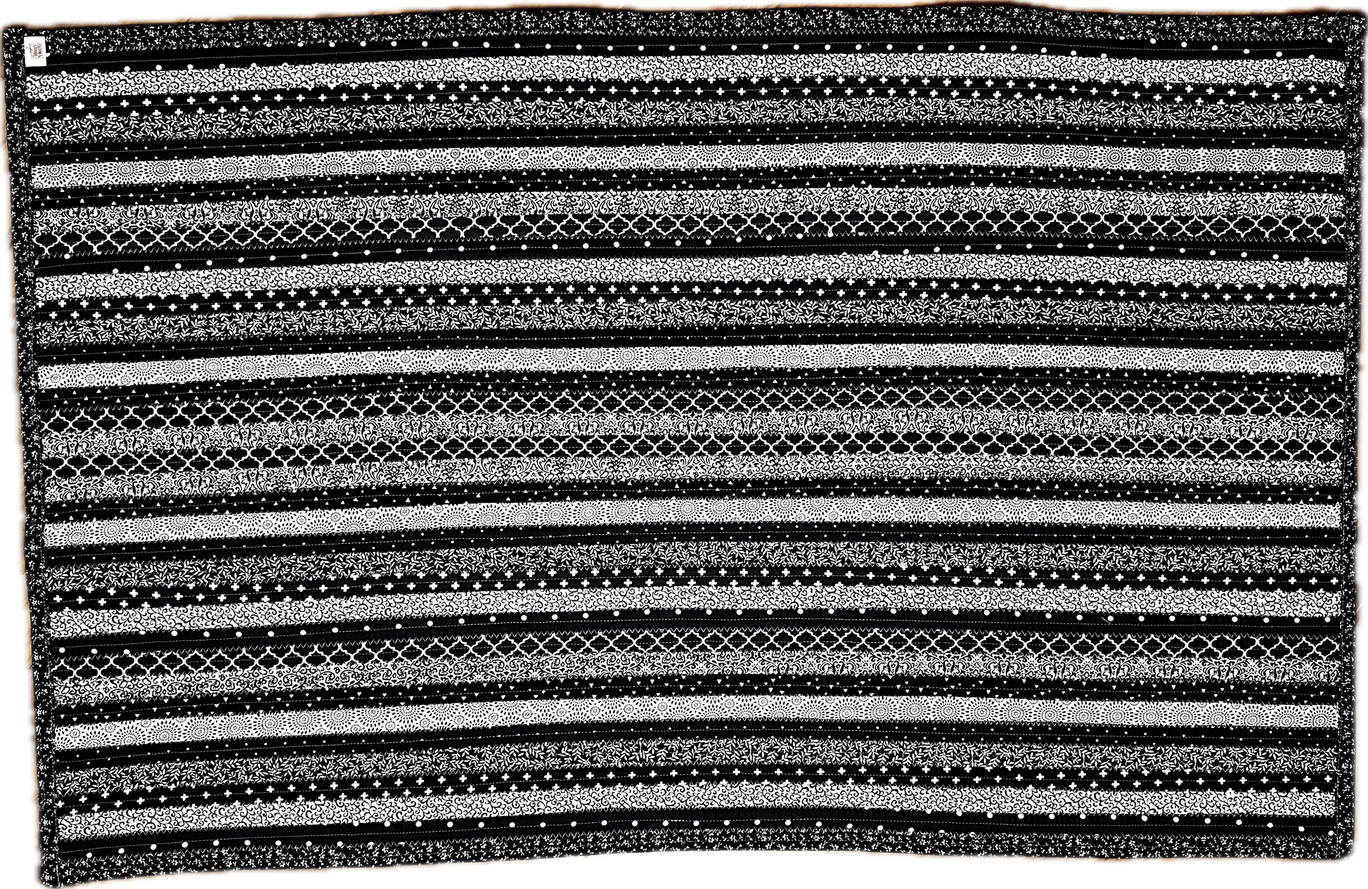 This unique jelly roll rug is made with black and white hued cotton fabric and cotton blend batting. Size Approximately 24"X40"