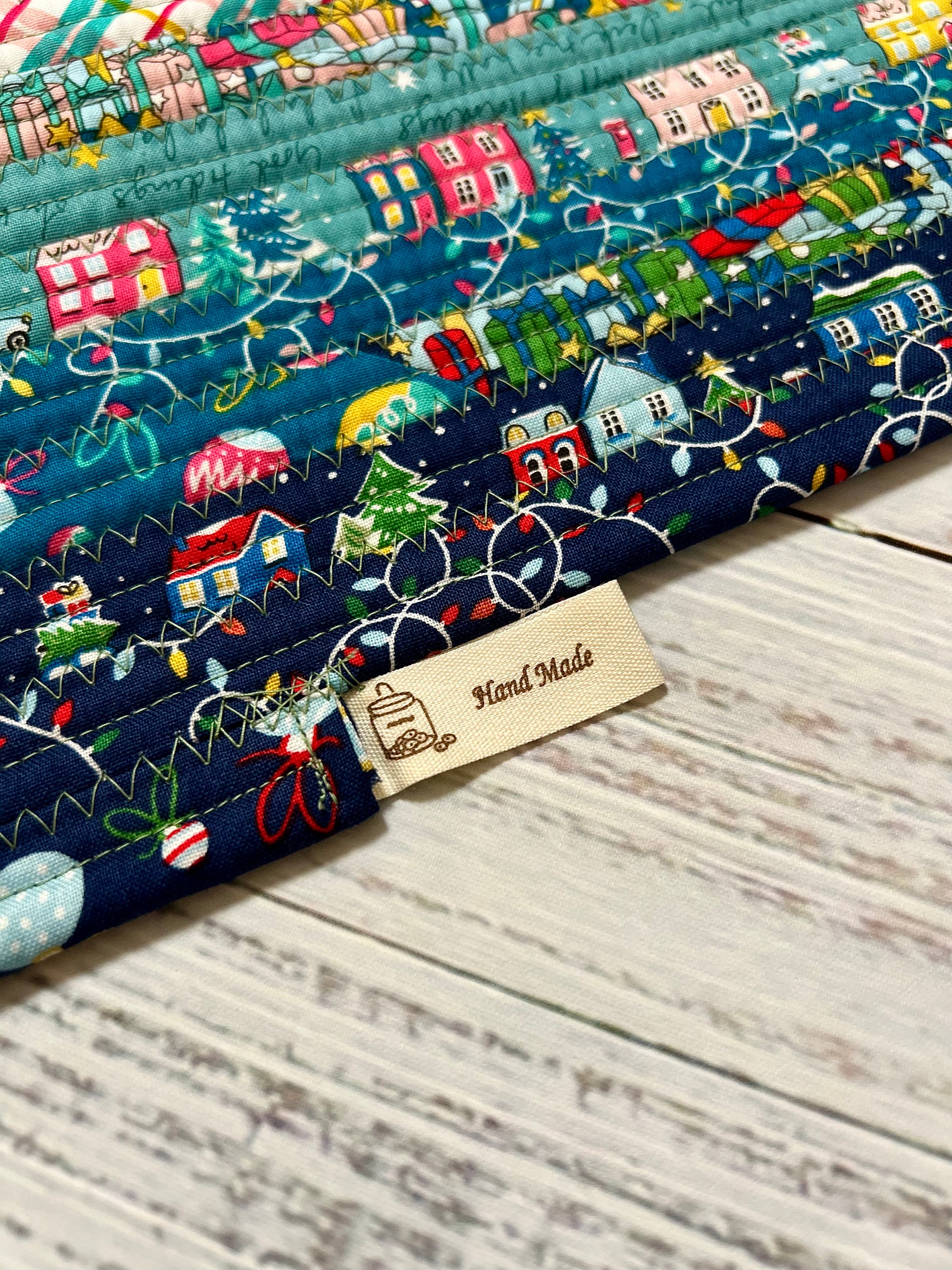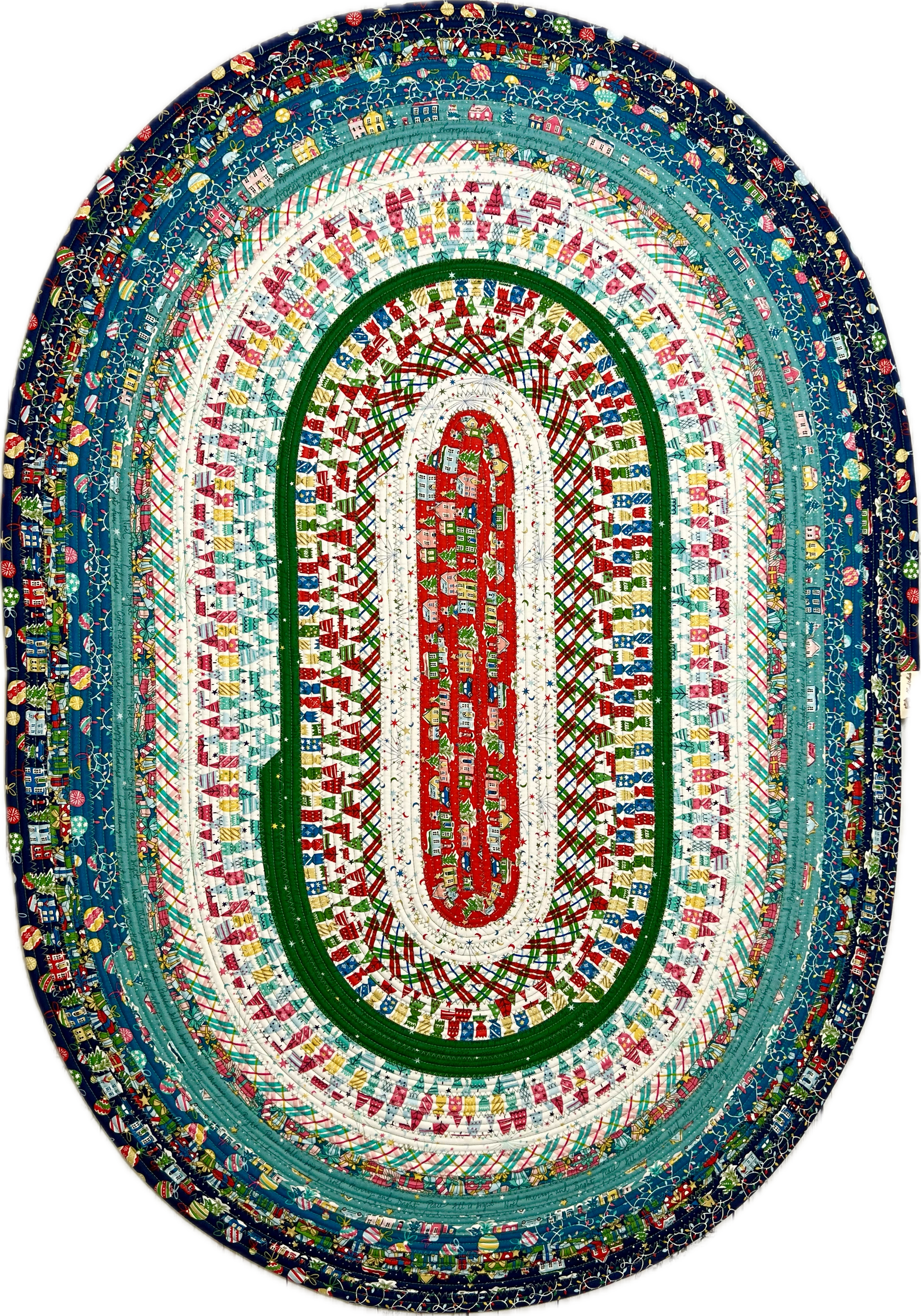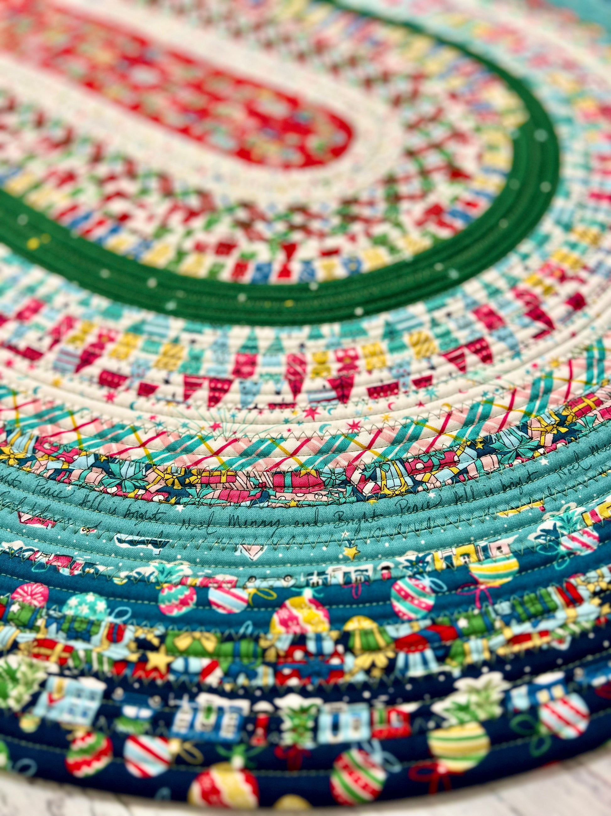 This unique jelly roll rug is made with multi-colored cotton fabric and cotton blend batting. Fabric designed by Liberty Fabric for Riley Blake
