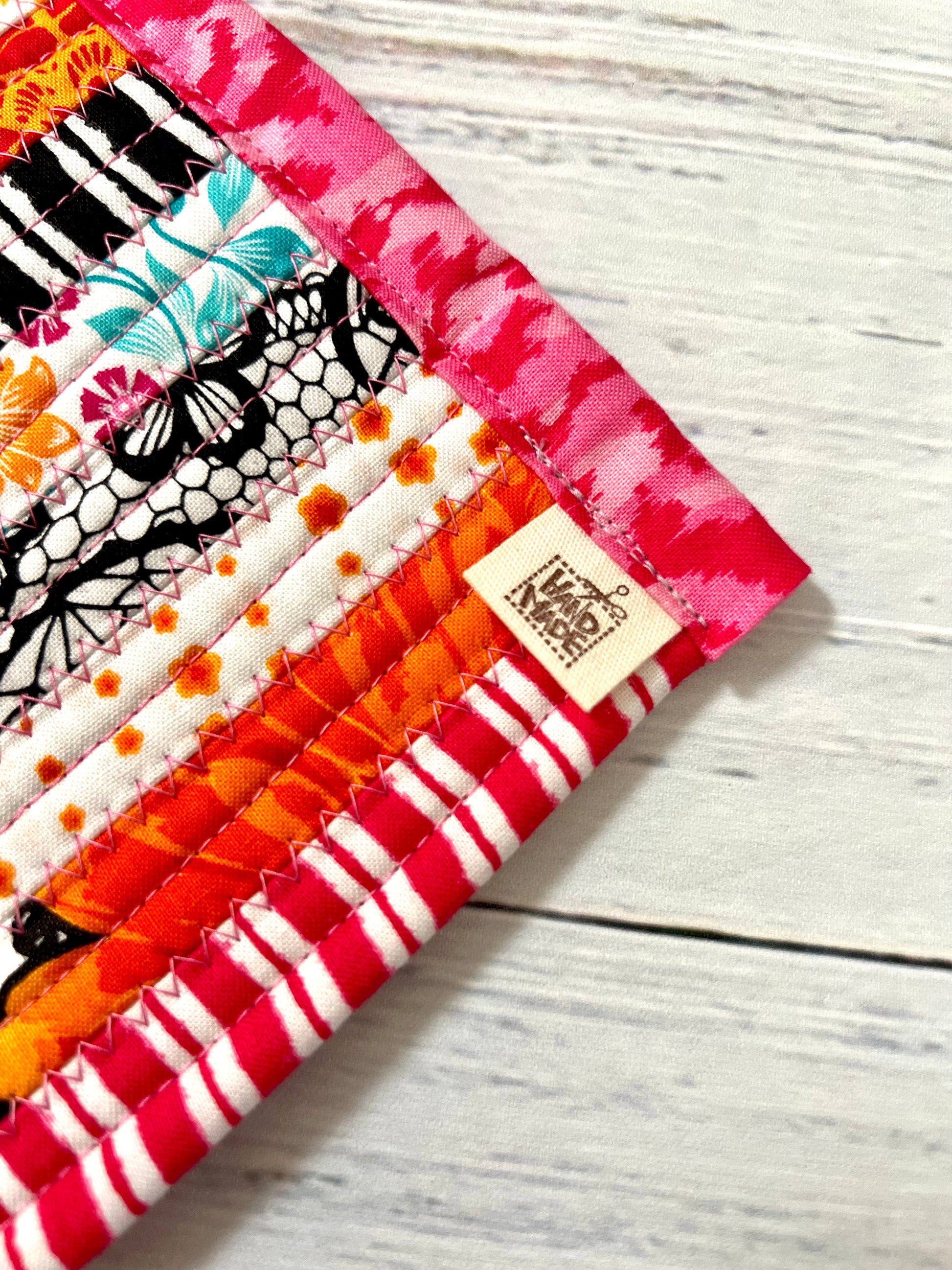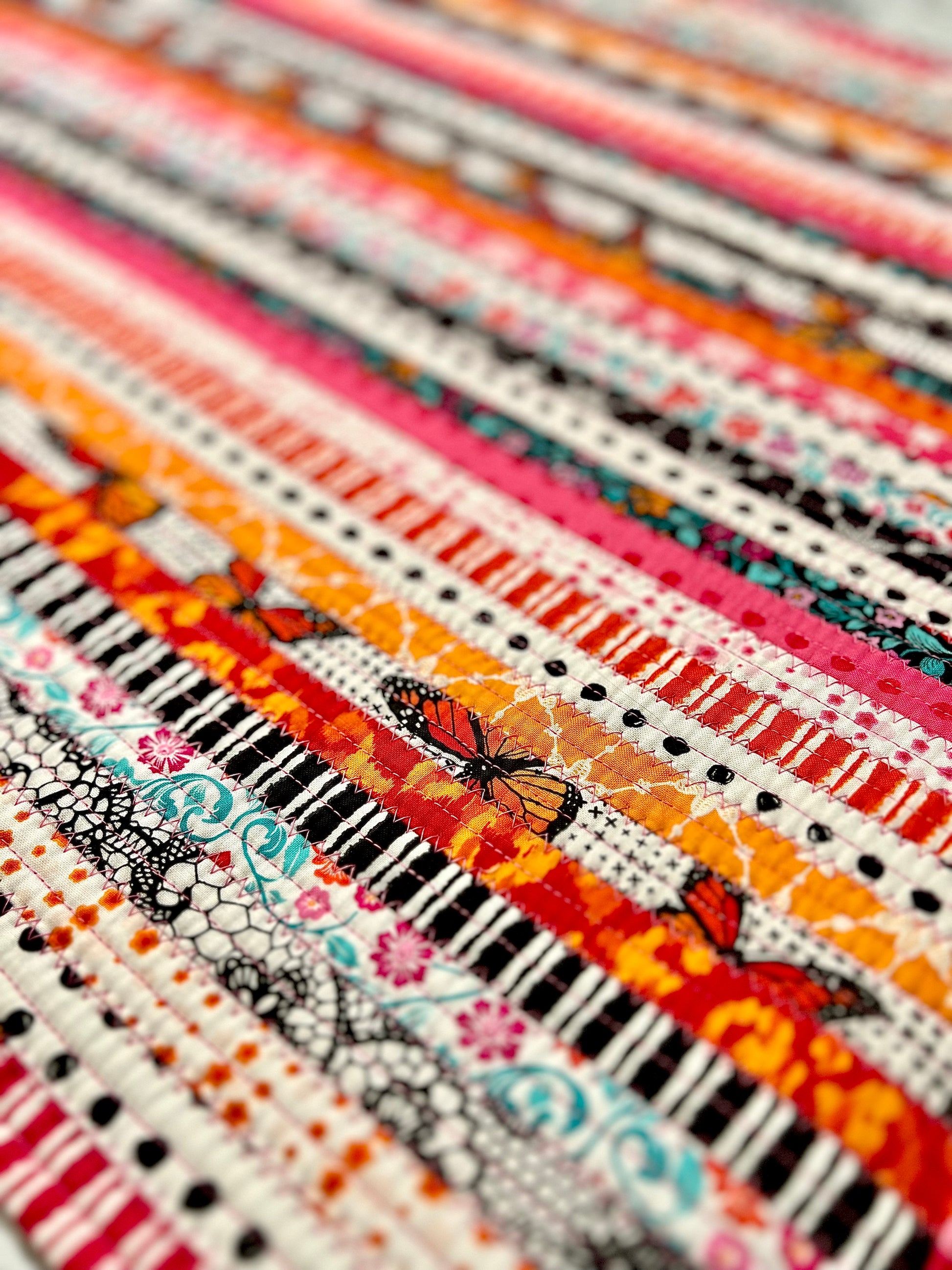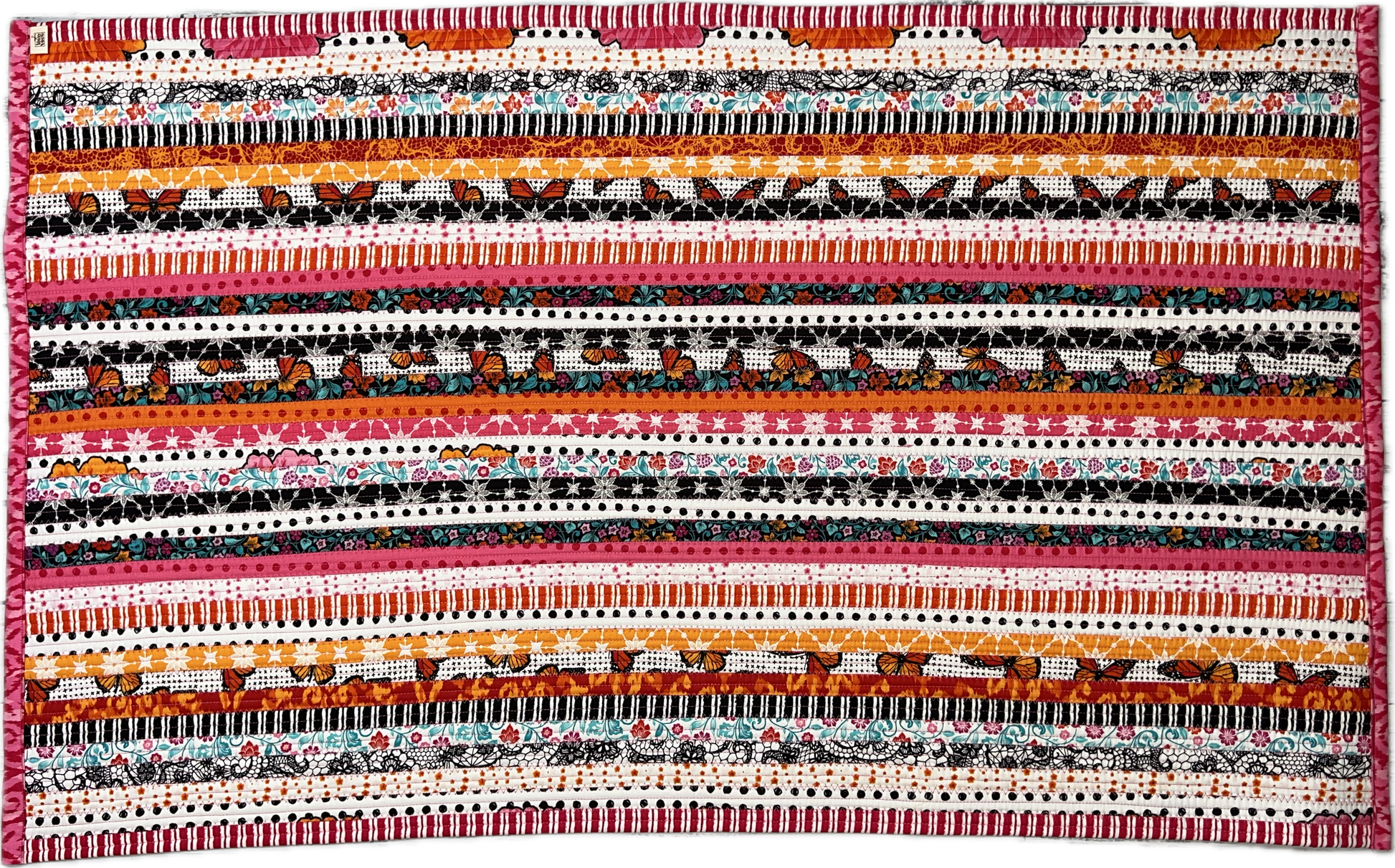 This unique jelly roll rug is made with multi-colored cotton fabric and cotton blend batting. Fabric designed by Patrick Lose. Size Approximately 24"X40"