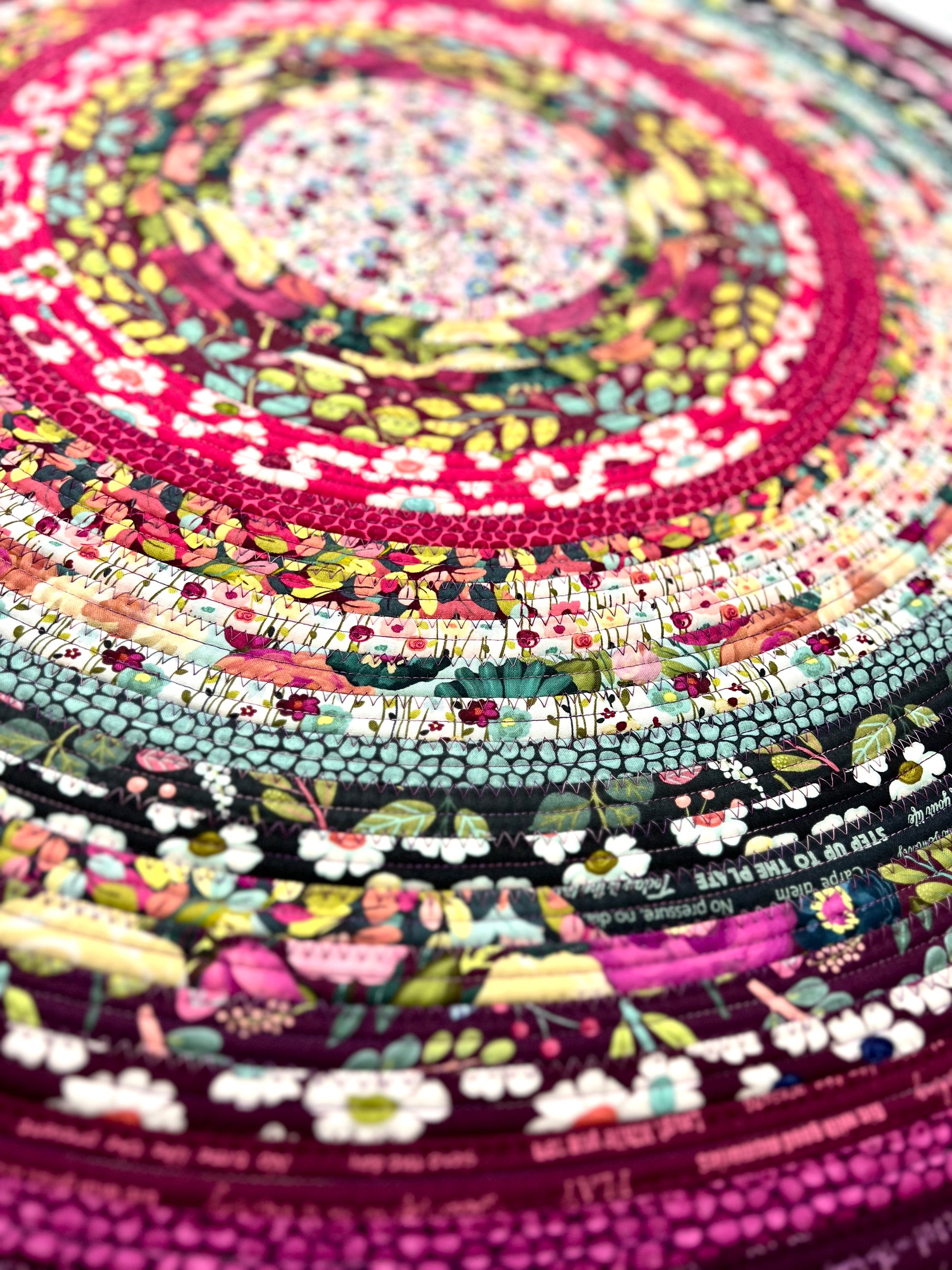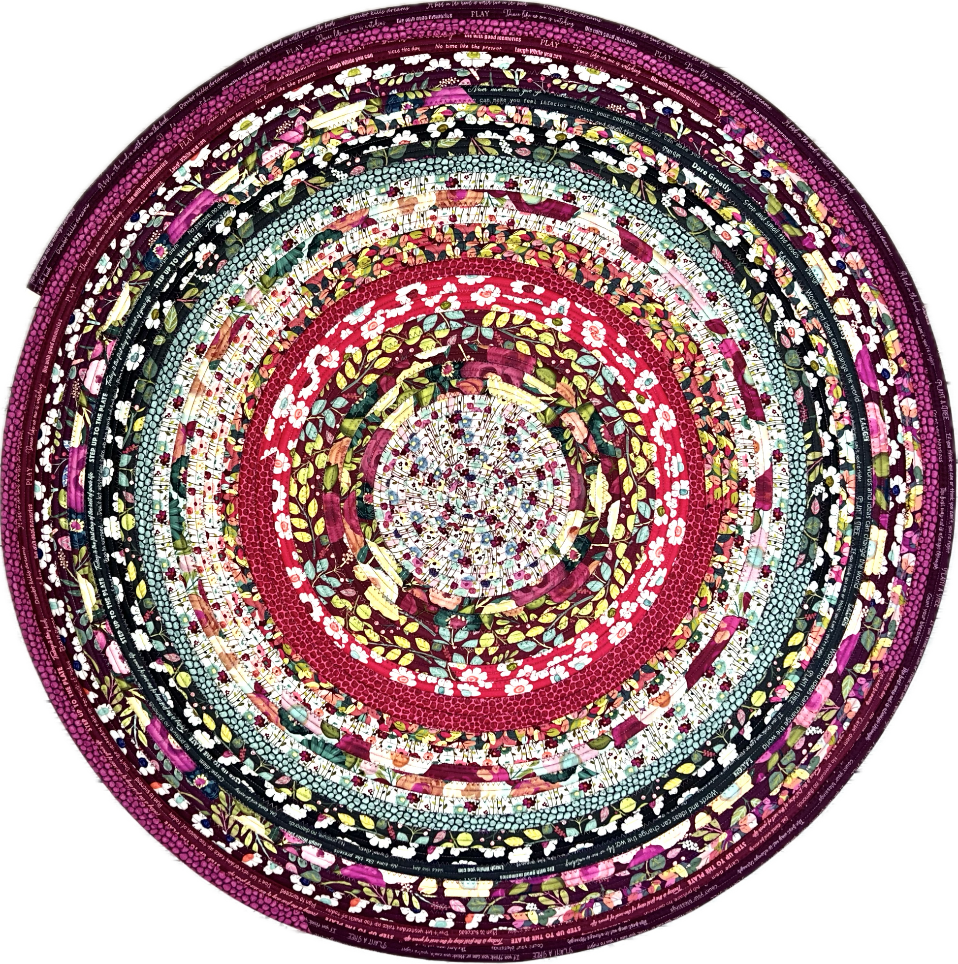 This unique jelly roll rug is made with multi-colored cotton fabric and cotton blend batting. Fabric designed by Lila Tuellar for Riley Blake. Size Approximately 36" diameter.