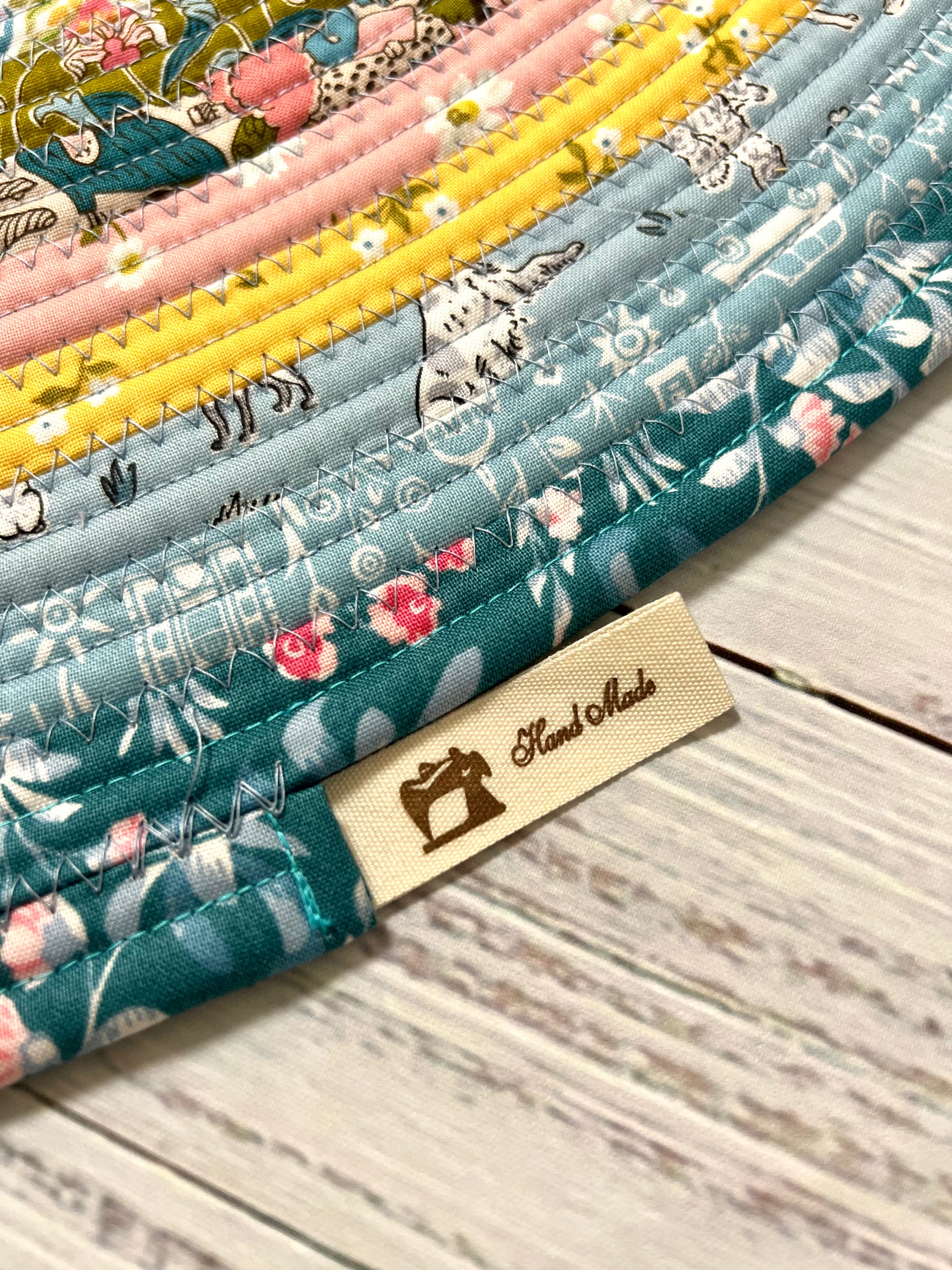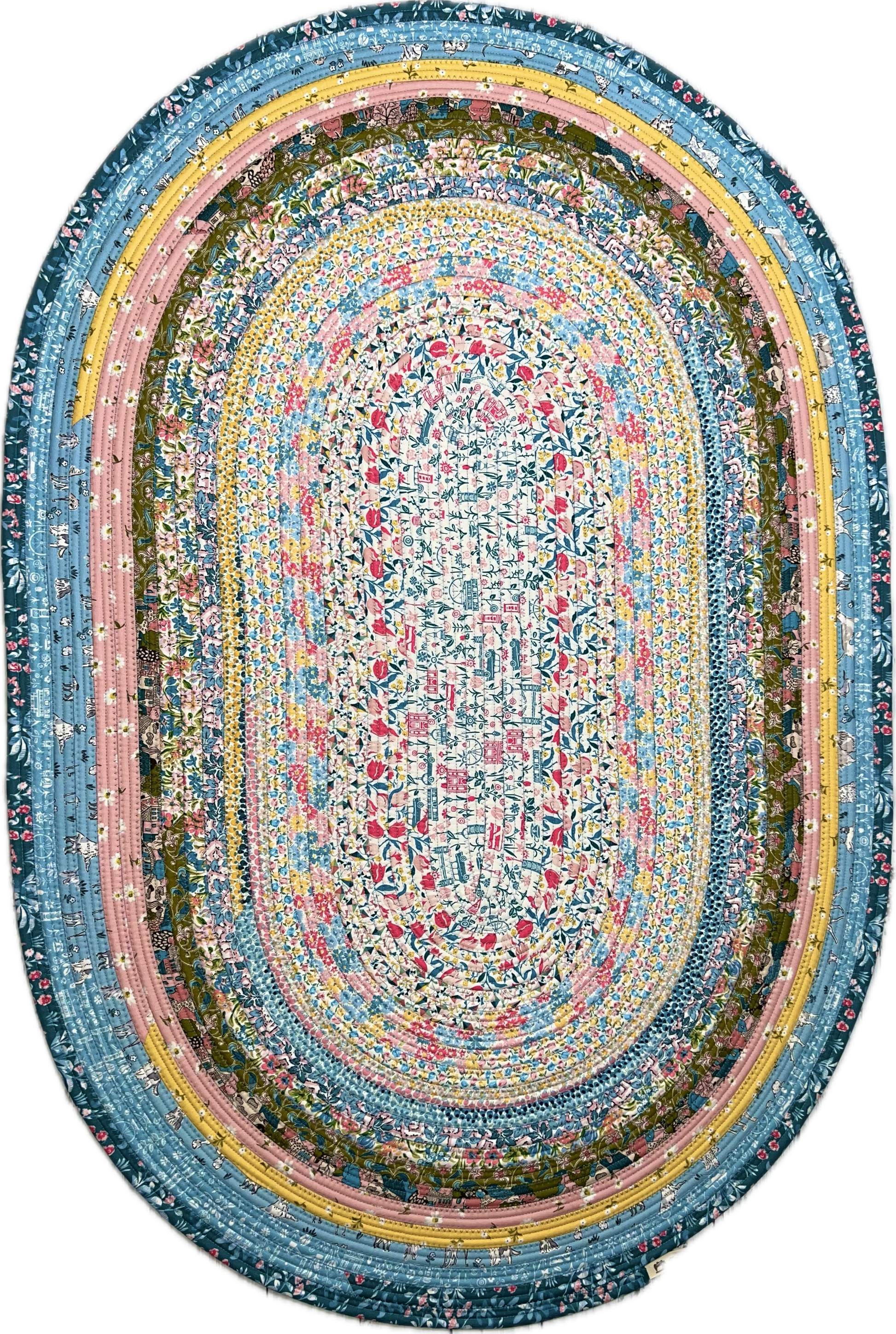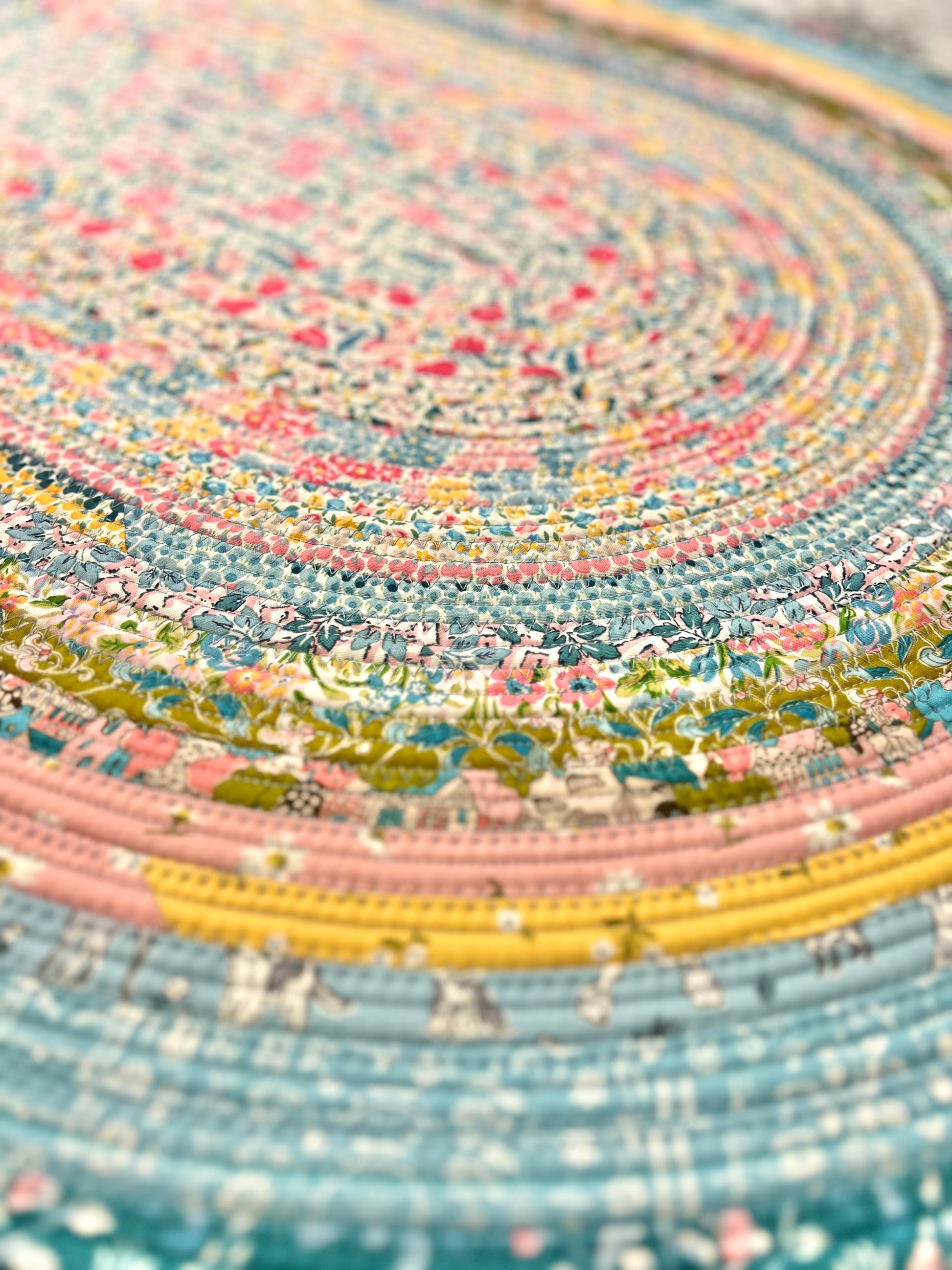 This unique jelly roll rug is made with multi-colored cotton fabric and cotton blend batting. Fabric designed by Liberty Fabrics for Riley Blake
