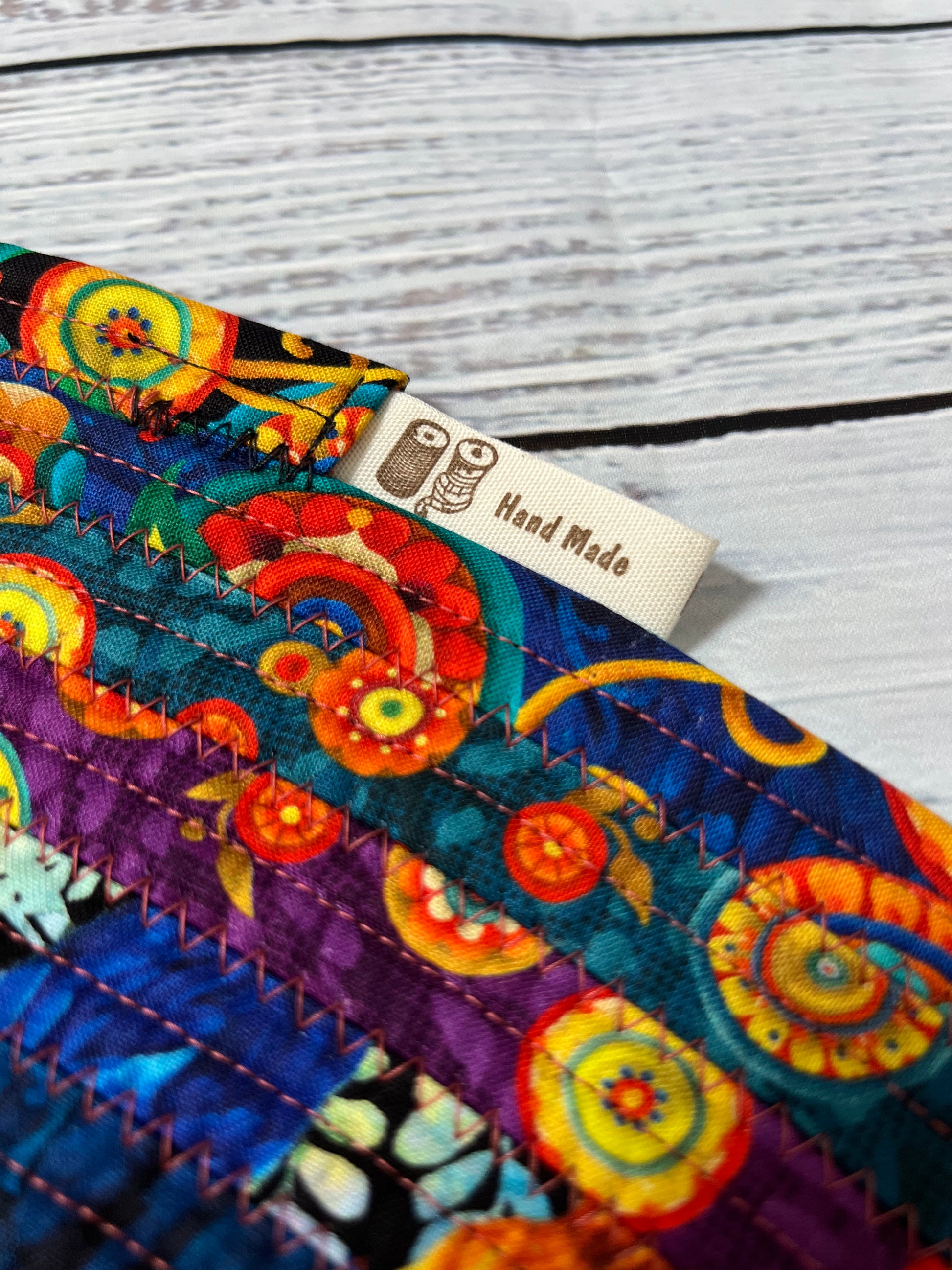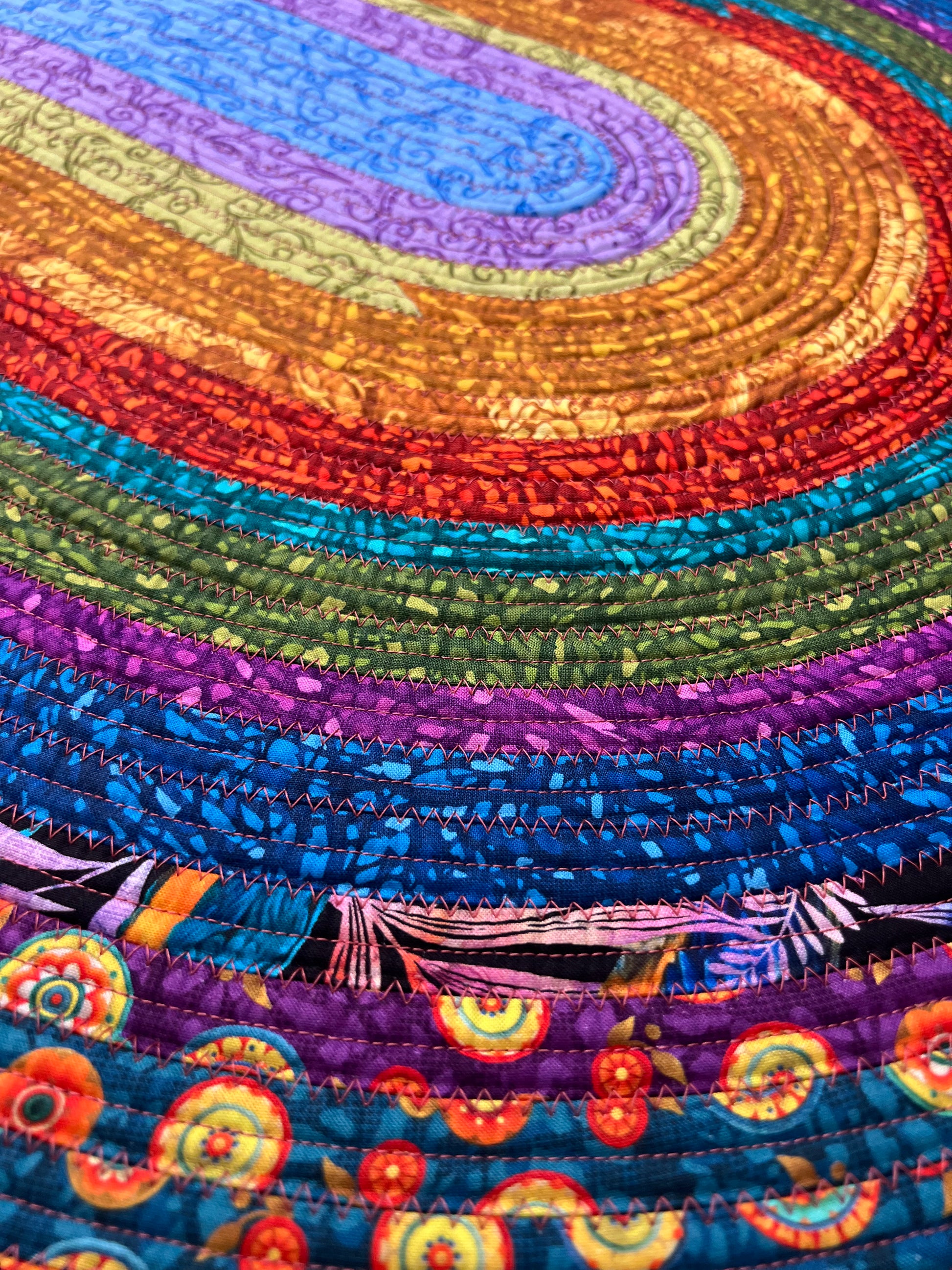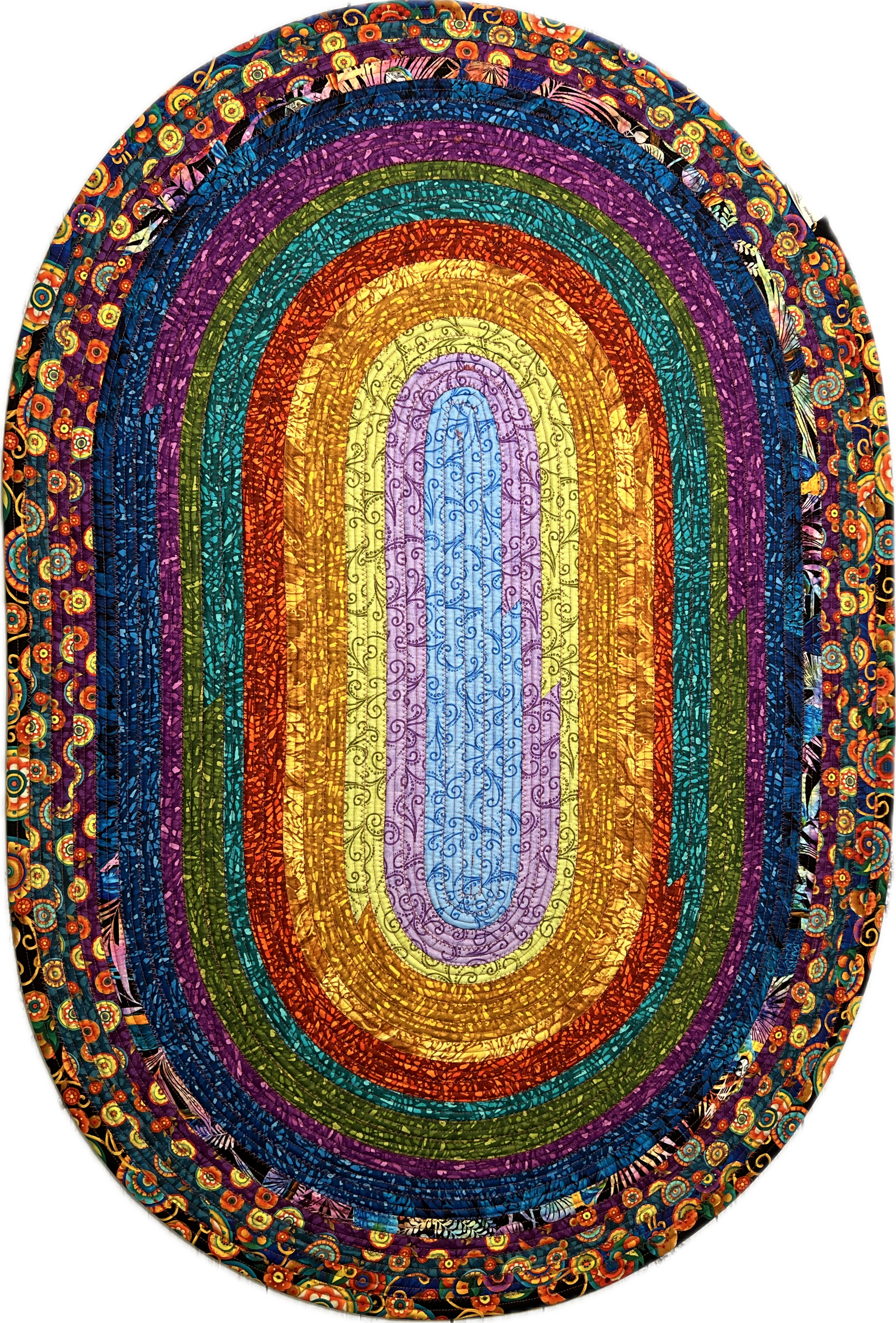 This unique jelly roll rug is made with multi-colored cotton fabric and cotton blend batting. Fabric designed by David Galchutt for Benartix. Size Approximately 29"X42"