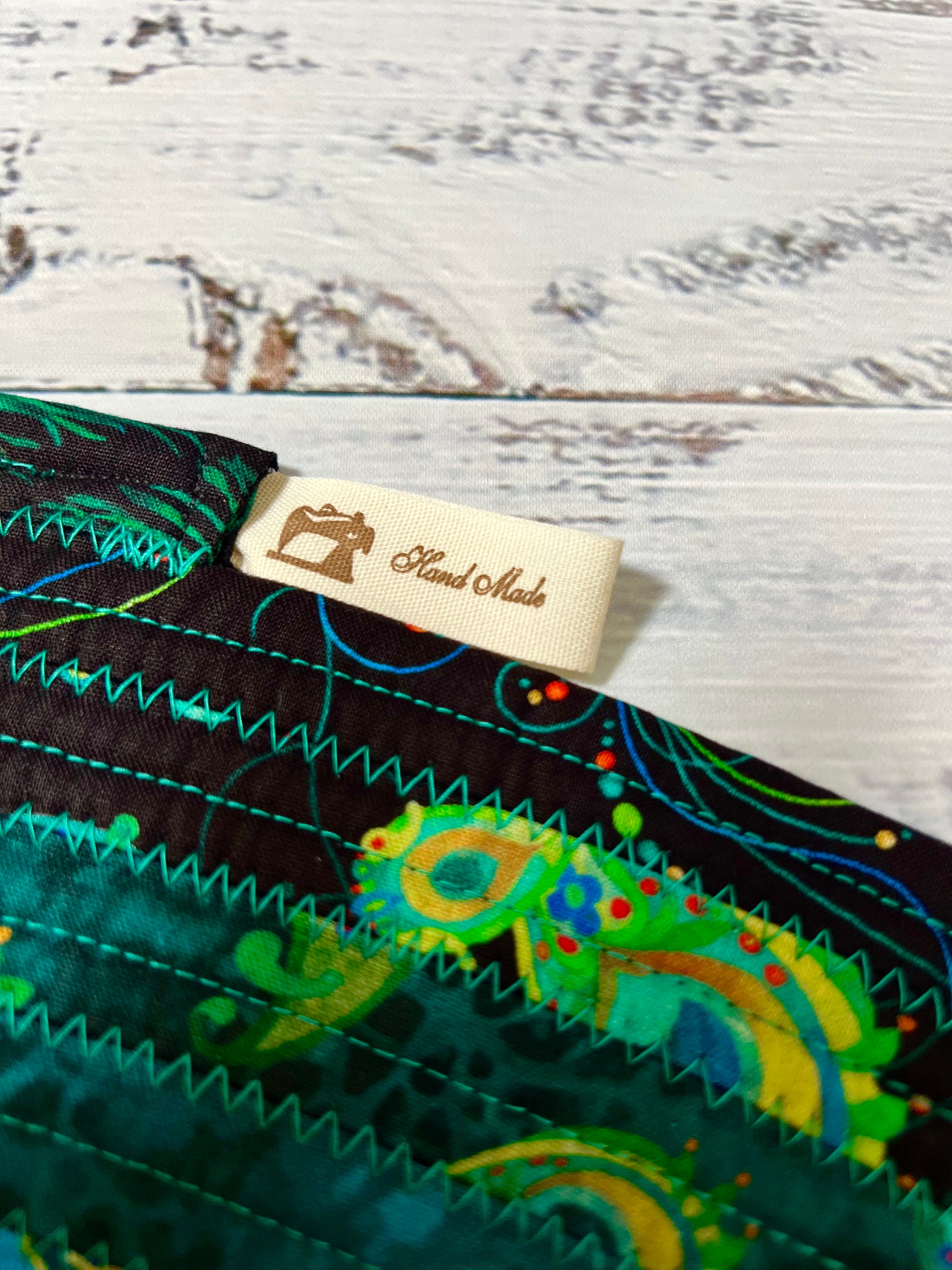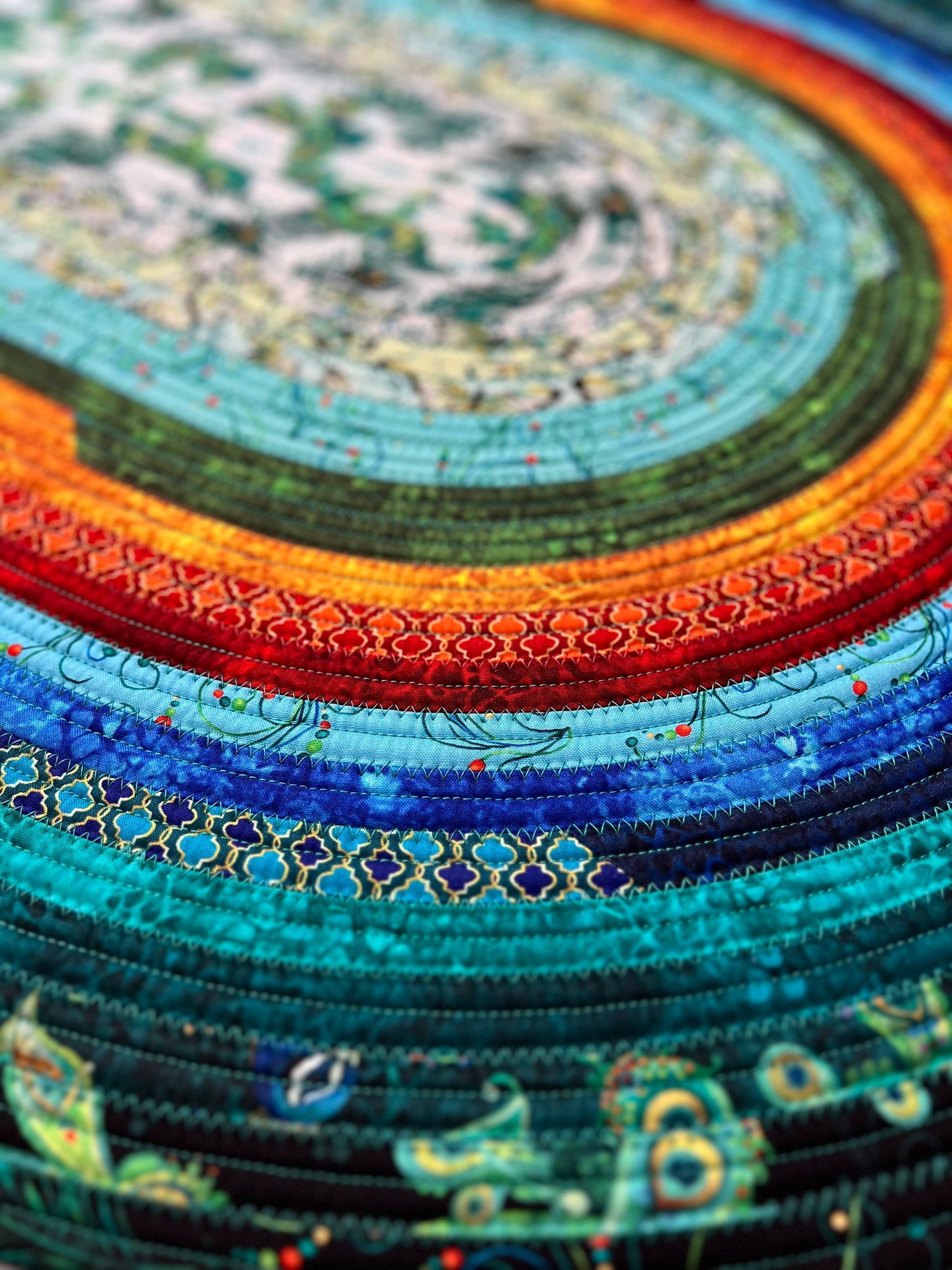 This unique jelly roll rug is made with multi-colored cotton fabric and cotton blend batting. Fabric designed by David Galchutt for Benartex. Size Approximately 29"X42"