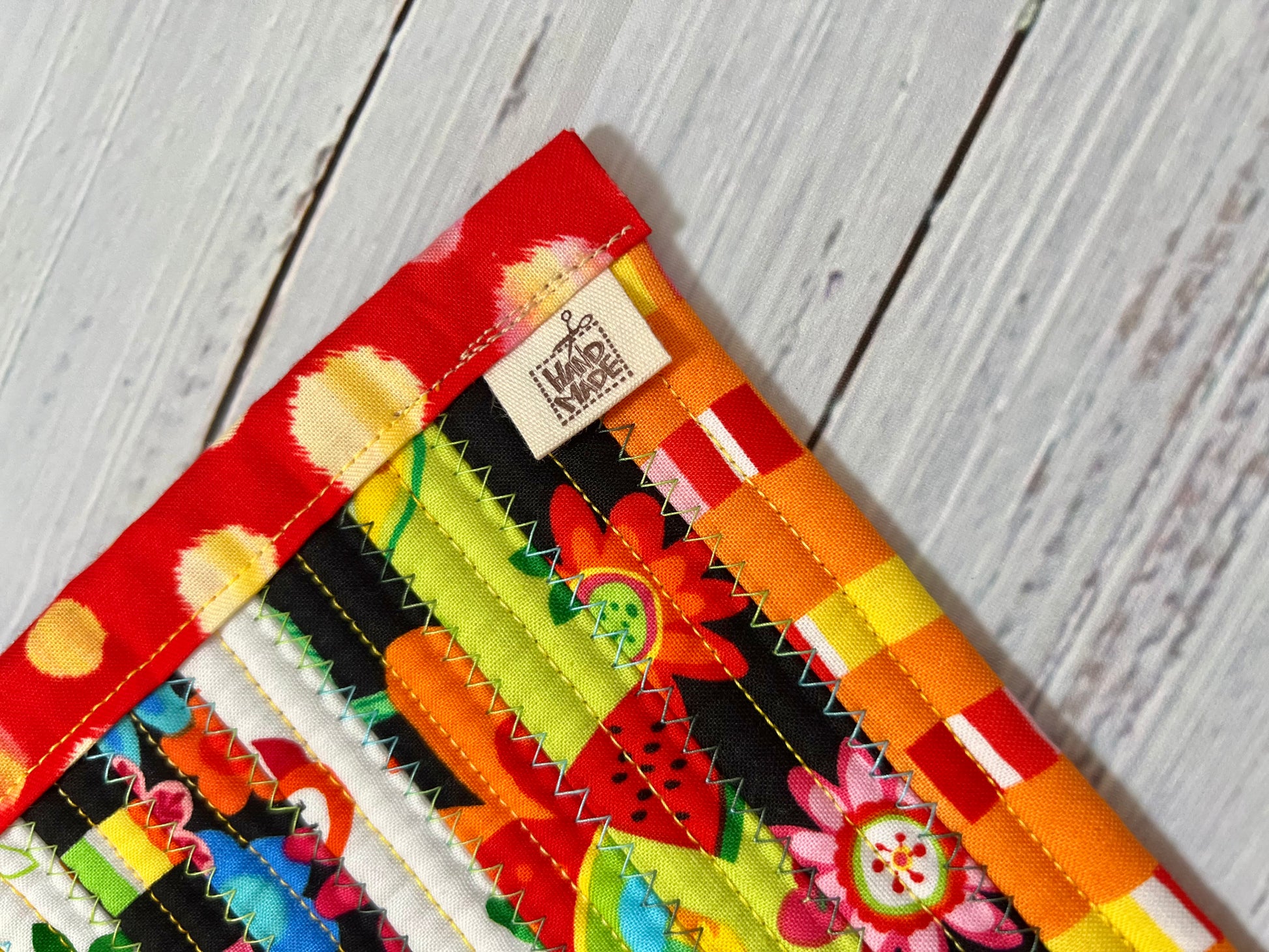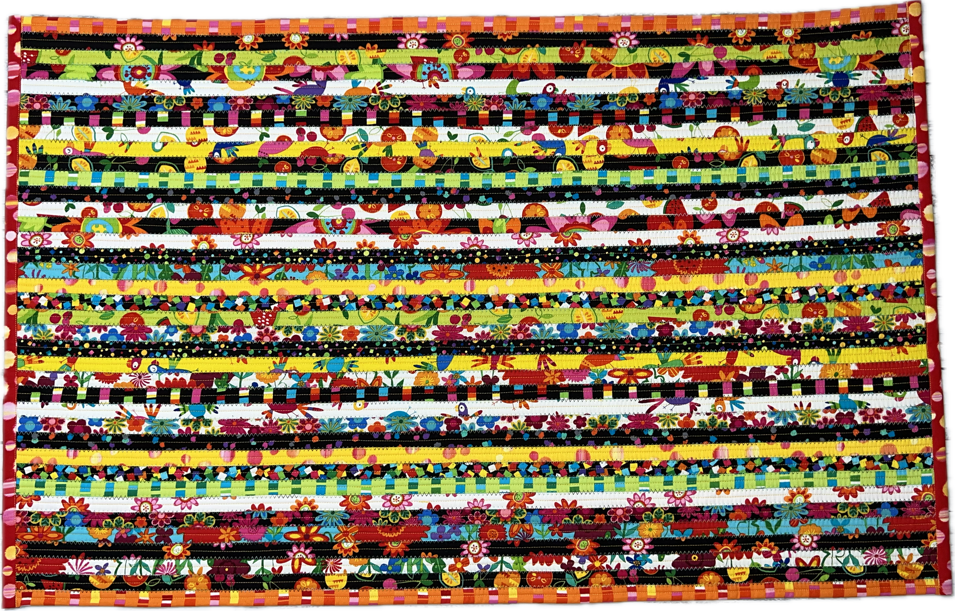 This unique jelly roll rug is made with multi-colored cotton fabric and cotton blend batting. Size Approximately 24"X40"