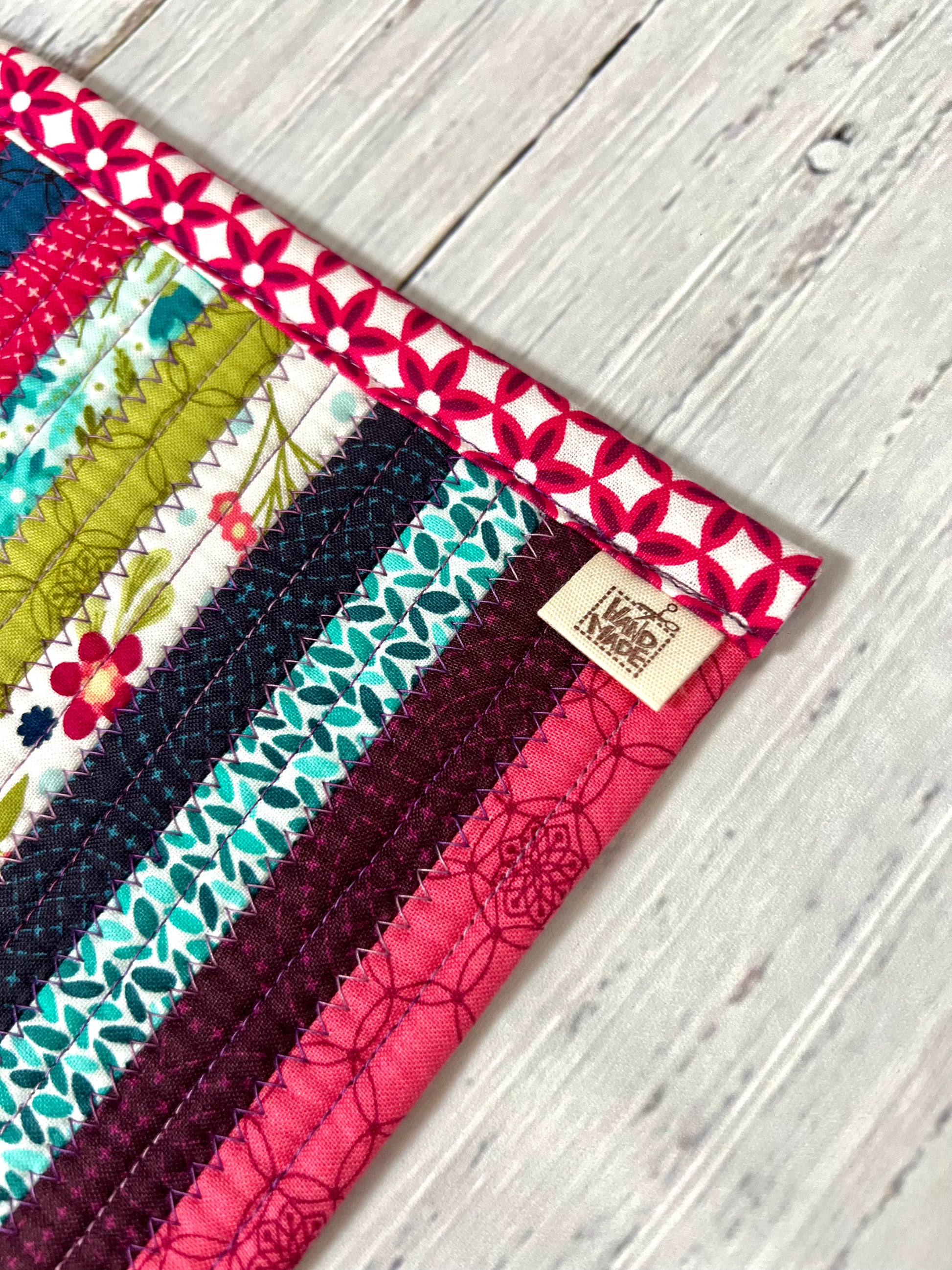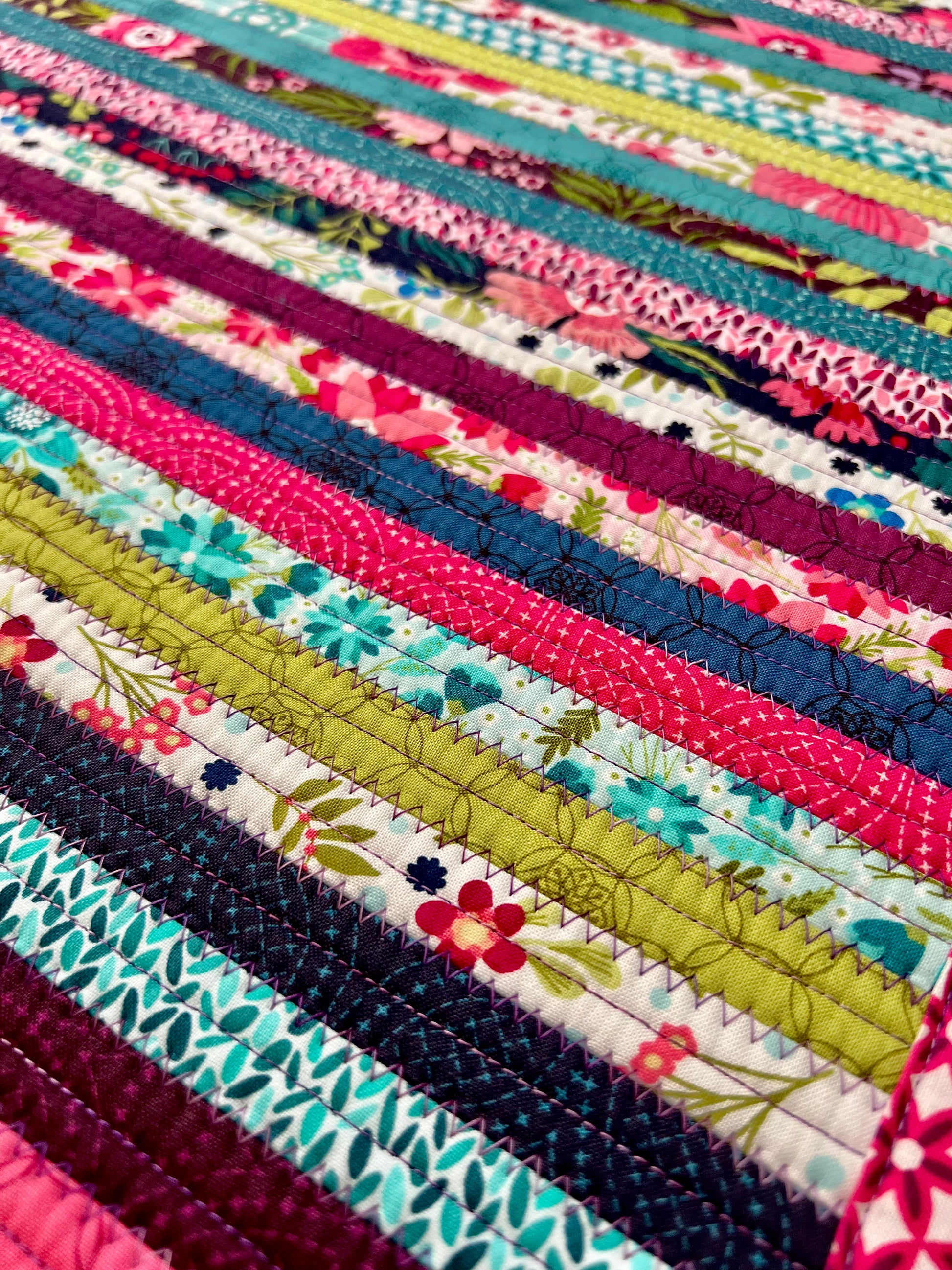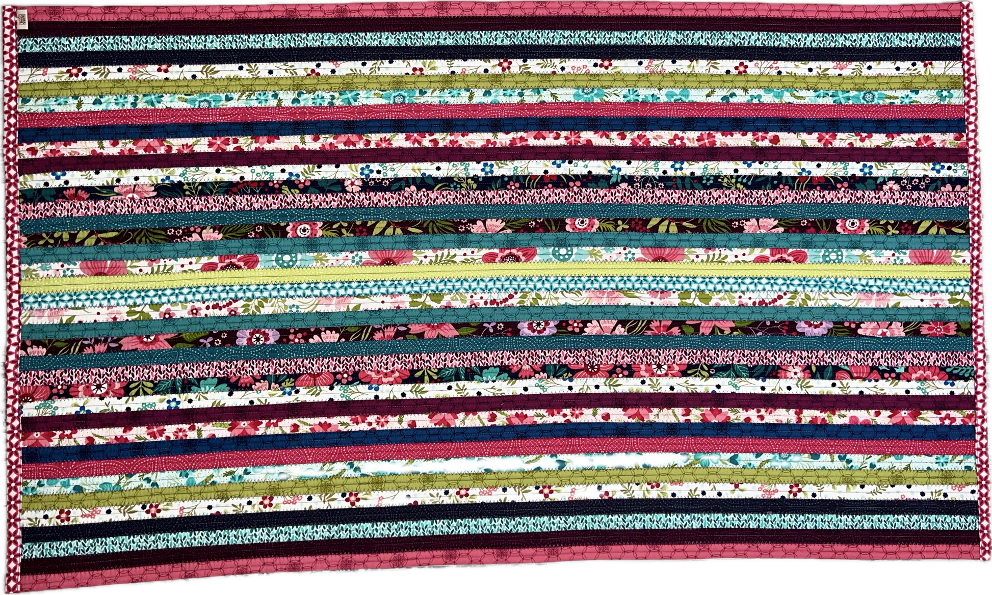 This unique jelly roll rug is made with multi-colored cotton fabric and cotton blend batting. Fabric designed by Shelley Cavanna. Size Approximately 24"X40"