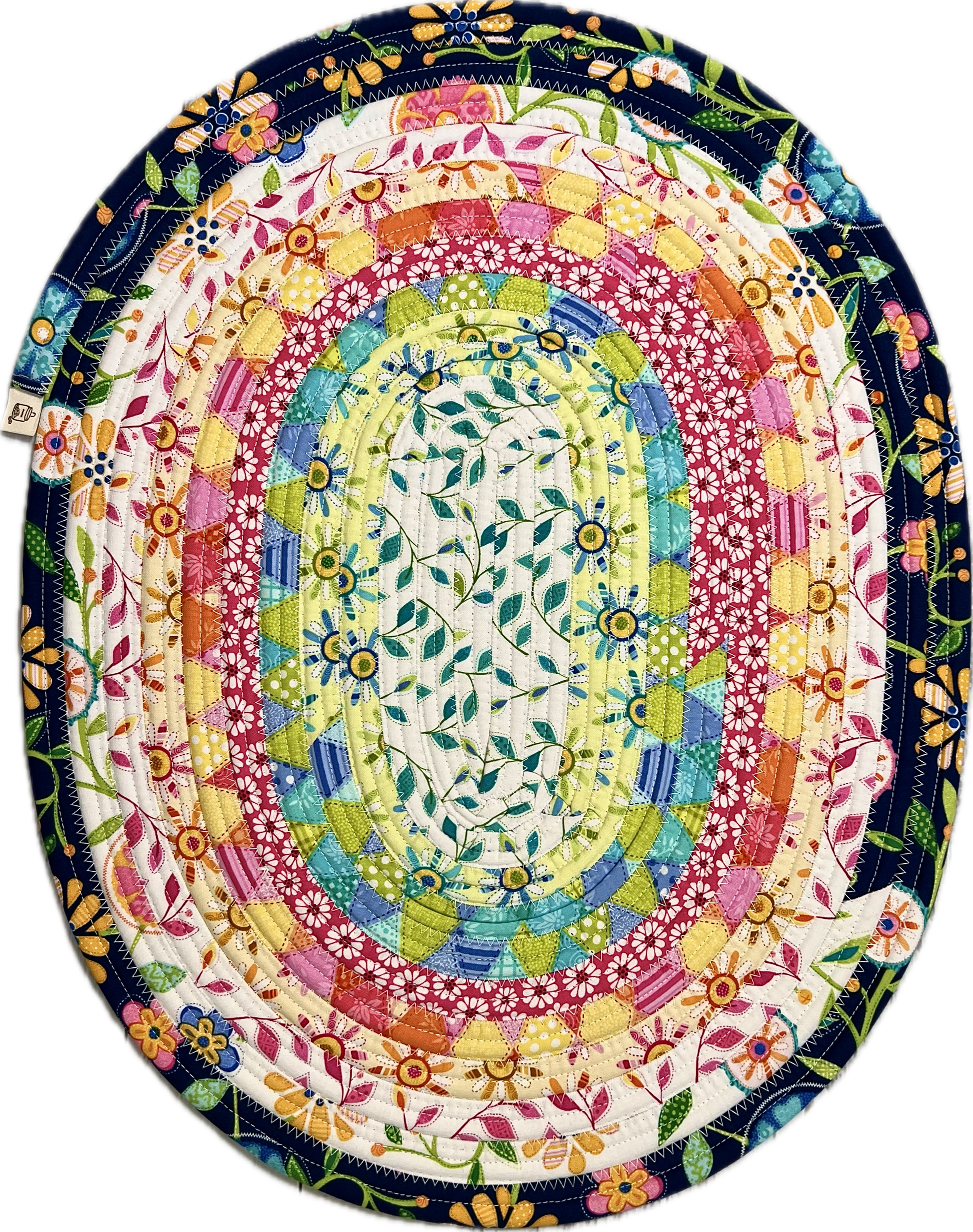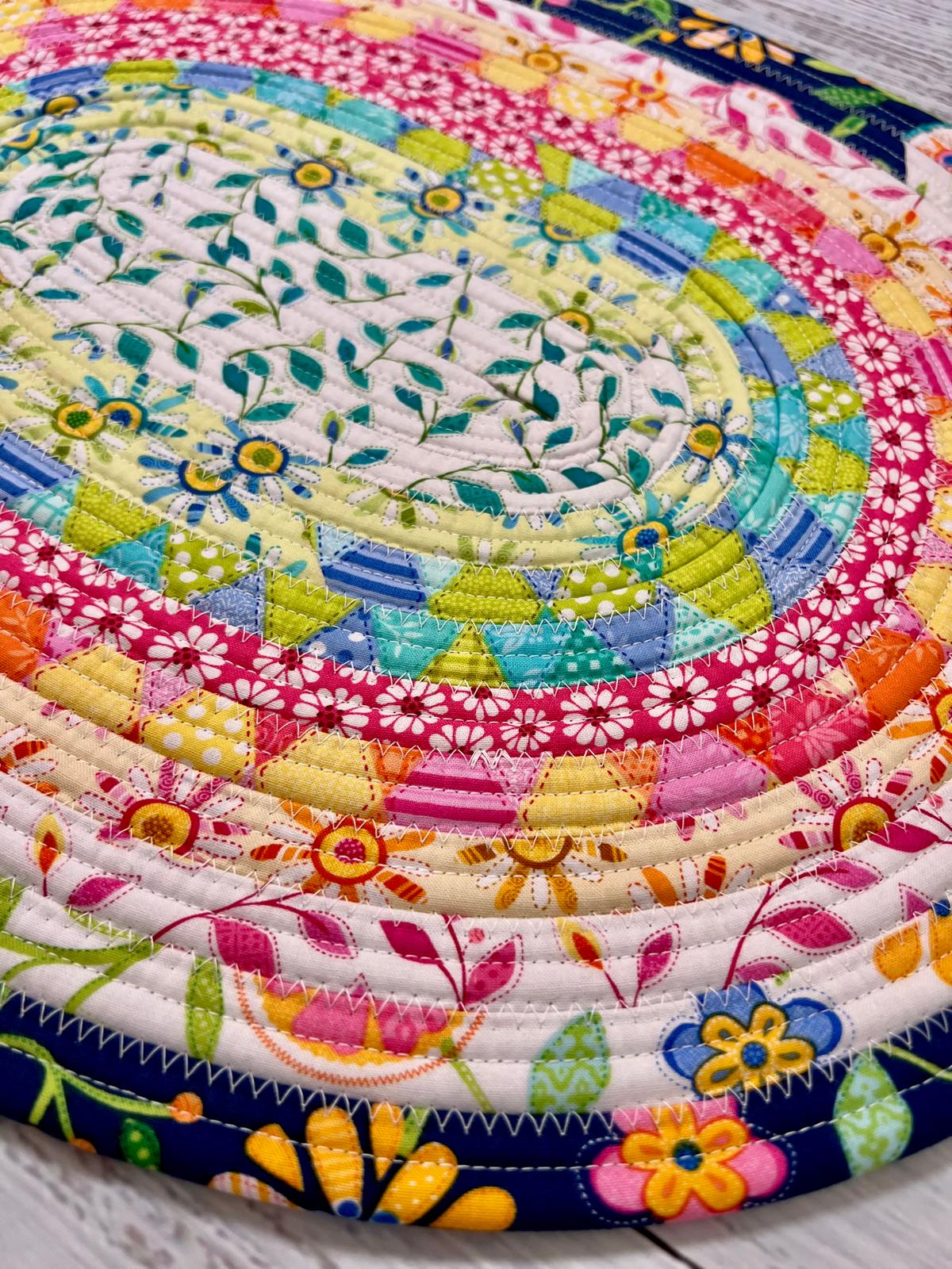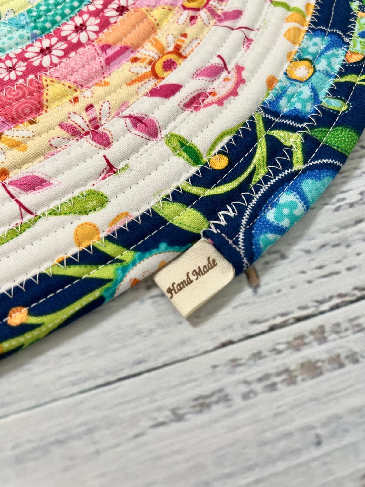 This unique placemat is made with multi-colored cotton fabric and cotton blend batting. Fabric designed by Jessica Flick for Riley Blake. Size Approximately 15"X21"