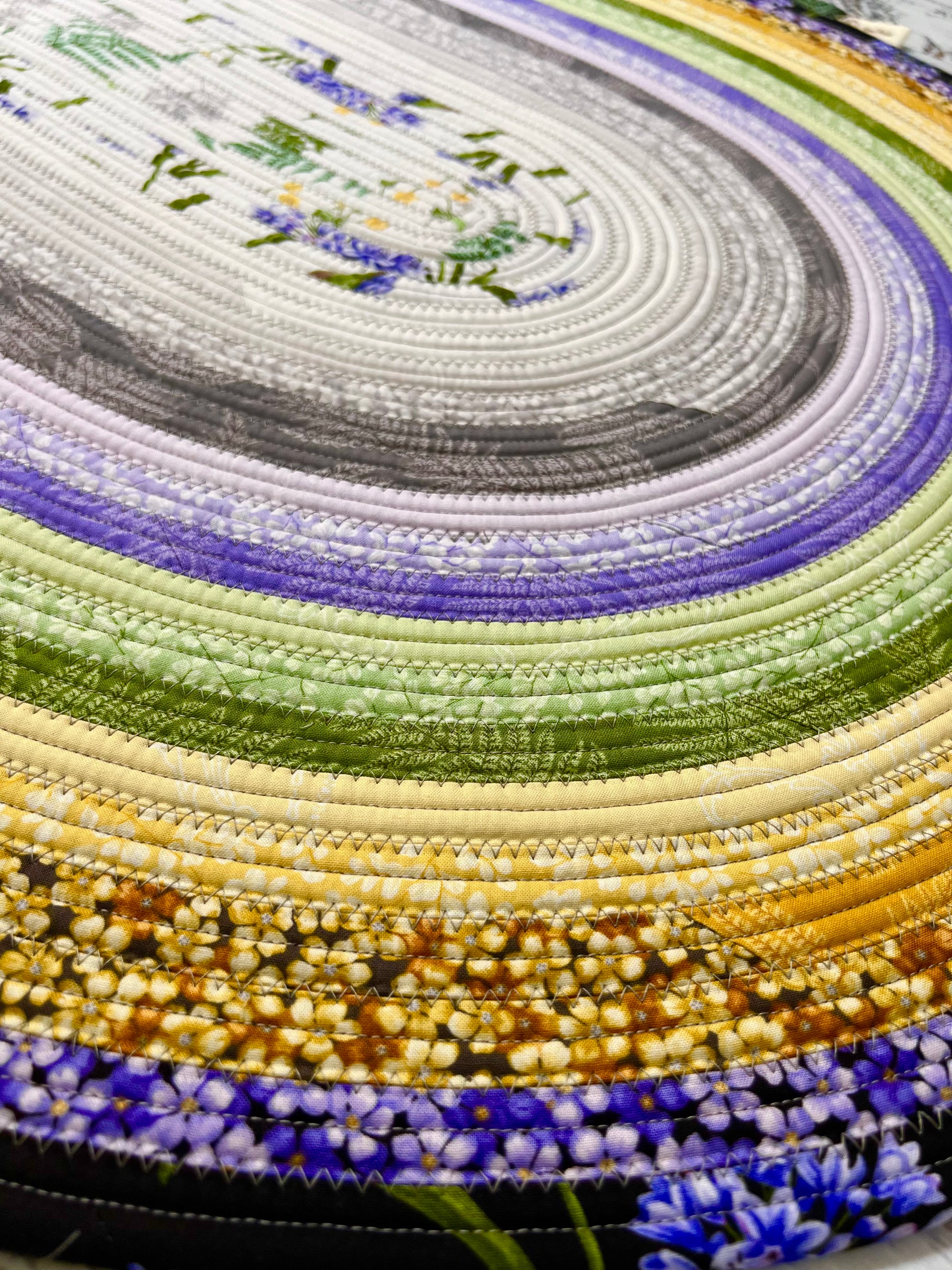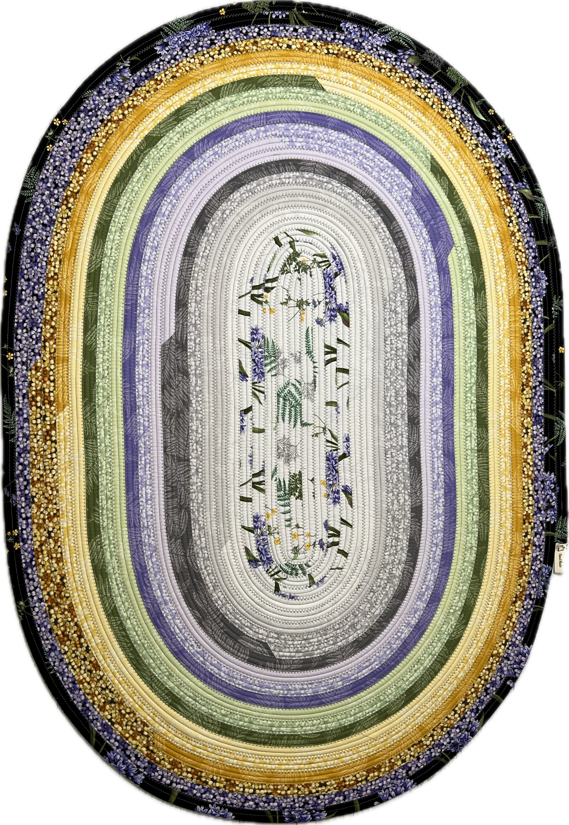 This unique jelly roll rug is made with multi-colored cotton fabric and cotton blend batting. Fabric designed by Jackie Robinson for Benartex. Size Approximately 29"X42"